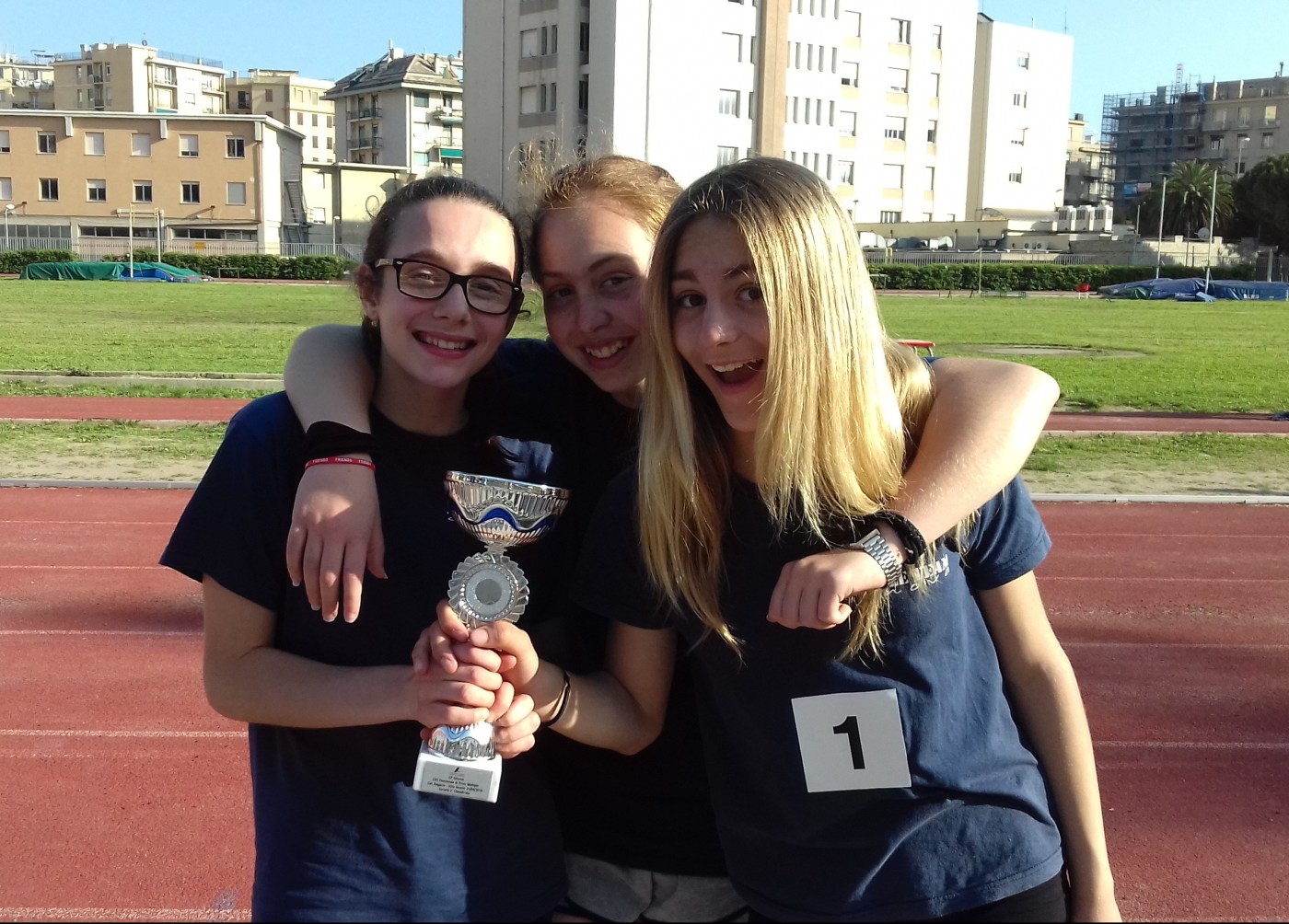 La prima “fatica” consisteva nei 60mt ostacoli, già dalle prime prove i propositi erano abbastanza buoni e in effetti così è stato! Un po’ di paura prima di partire, ma una volta sui blocchi si pensa solo a fare il meglio! E anzi.. se ad allenamento certi particolari non riuscivamo ad affinarli, l’adrenalina e la voglia di fare fanno la loro parte: Giada 11″9, Giorgia 12″1 e Martina, che era la più timorosa, 13″3!