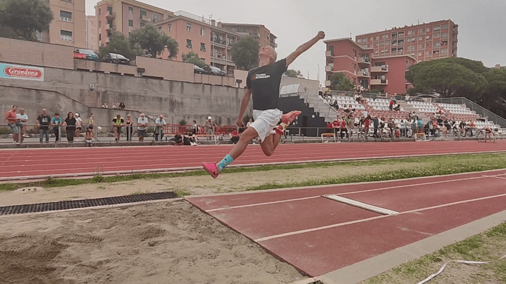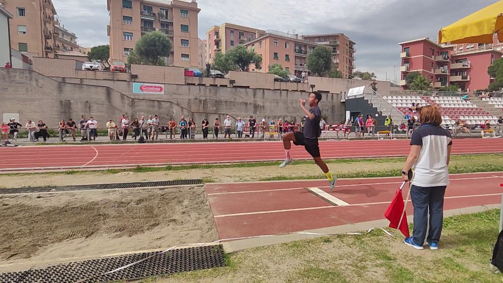 Nella pedana del salto in lungo danno battaglia Enzo, Francesco, Leonardo e Brian, si litiga con l’asse di battuta. Enzo si aggiudica comunque anche questa gara con la misura di 6.03, sale sul primo gradino del podio vincendo la medaglia d’oro! Francesco si classifica quarto con dei salti molto buoni, ma regala davvero troppo alla pedana.. questo si sa: il salto in lungo può essere impietoso a volte.. e lo sanno anche Leo e Brian che lasciano registrate delle misure che non rispecchiano affatto il loro valore. Avranno comunque modo di rifarsi!